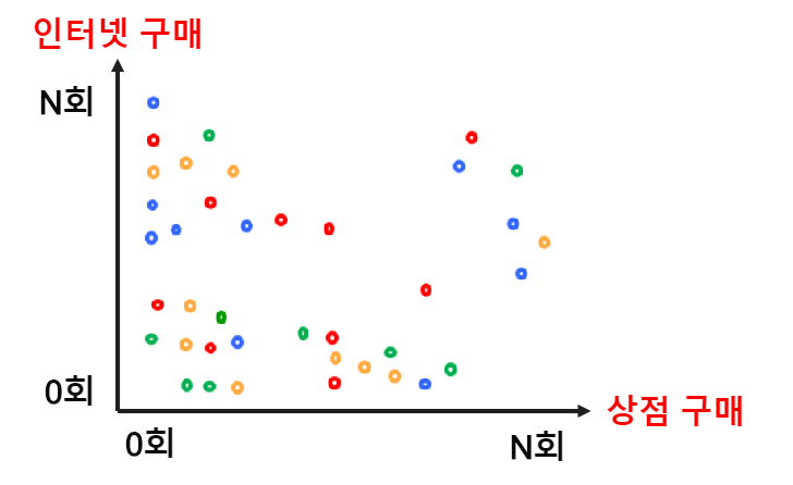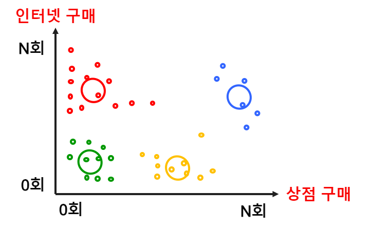 ③ 으로 돌아가서 다시 중심을 계산합니다. 중심이 움직이지 않게 되면 클러스터링을 종료하는 것입니다. 이 결과에 그룹 이름을 지정하면, 예를 들어, 파란색: 로열 고객, 빨강: 인터넷 고객, 노랑: 점포 고객, 녹색: 랭크 업 고객이라는 느낌일까요? 먼저 그룹 이름(라벨)을 결정하여 분류하는 Classification에 비해 clustering은 그룹화한 후 적절한 그룹 이름을 붙이는 느낌입니다.