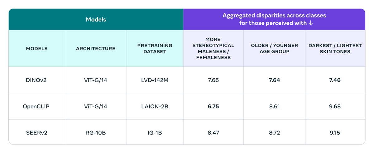 「DINOv2」,「OpenCLIP」,「SEERv2」라는 3개의 모델로 테스트한 결과는 아래와 같습니다. 그림의 왼쪽에는 모델 이름, 아키텍처 및 교육에 사용한 데이터 세트가 나열되어 있으며, 오른쪽에는 테스트 결과가 표시됩니다. 양극단 그룹의 인식률 차이를 스코어로 사용하기 때문에 값이 낮은 쪽이 보다 공정하고 공평한 모델입니다. 남녀 간의 차이에 대해서는 OpenCLIP에 미치지 못했지만, 연령이나 피부색에 관해서는 DINOv2가 가장 뛰어난 퍼포먼스를 발휘했습니다.