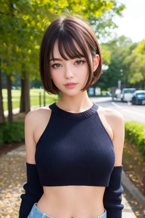 masterpiece, best quality, highres, photoreaslistic, detailed face, 1girl, upper body, medium breasts, short hair, black hair, cute, soft smile, outdoors, bare shoulders, sweater, miniskirt