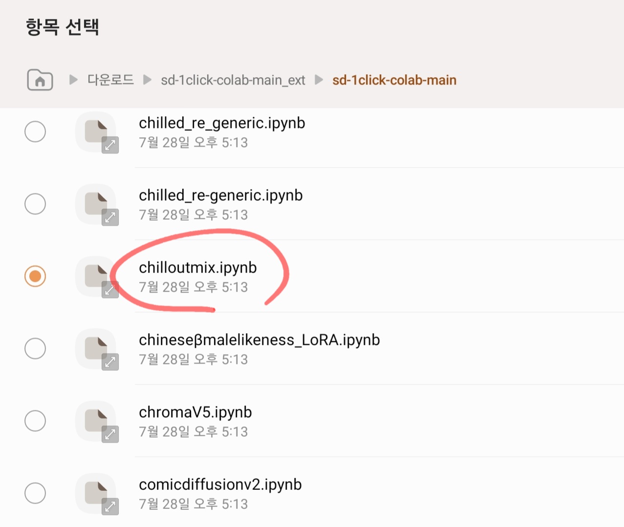 그다음, chilloutmix.ipynb 파일을 선택해 업로드합니다.