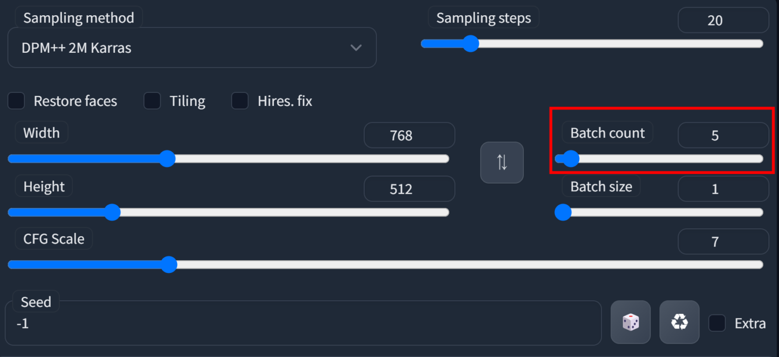 Seed의 오른쪽에 있는 주사위 버튼을 누르면 -1(seed가 랜덤이 된다)이 자동 입력되어, 주사위 오른쪽의 리사이클 마크를 클릭하면 생성한 이미지의 Seed를 표시할 수 있습니다.
