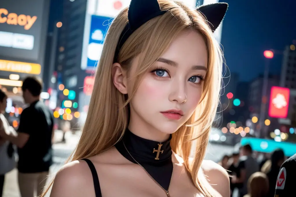 masterpiece, best quality, ultra high res, (photo realistic:1.4), ((1girl)), medium breasts, cleavage, upper body, close up of face shot, big blue eyes, cat ears, blonde hair, ( ulzzang-6500-v1.1:1.0), maid costume with a lot of frills, black shirt, cute, young, posing, looking at viewer, very long hair, cyberpunk, night city, neckless, cross, <lora:koreanDoll 0.3>