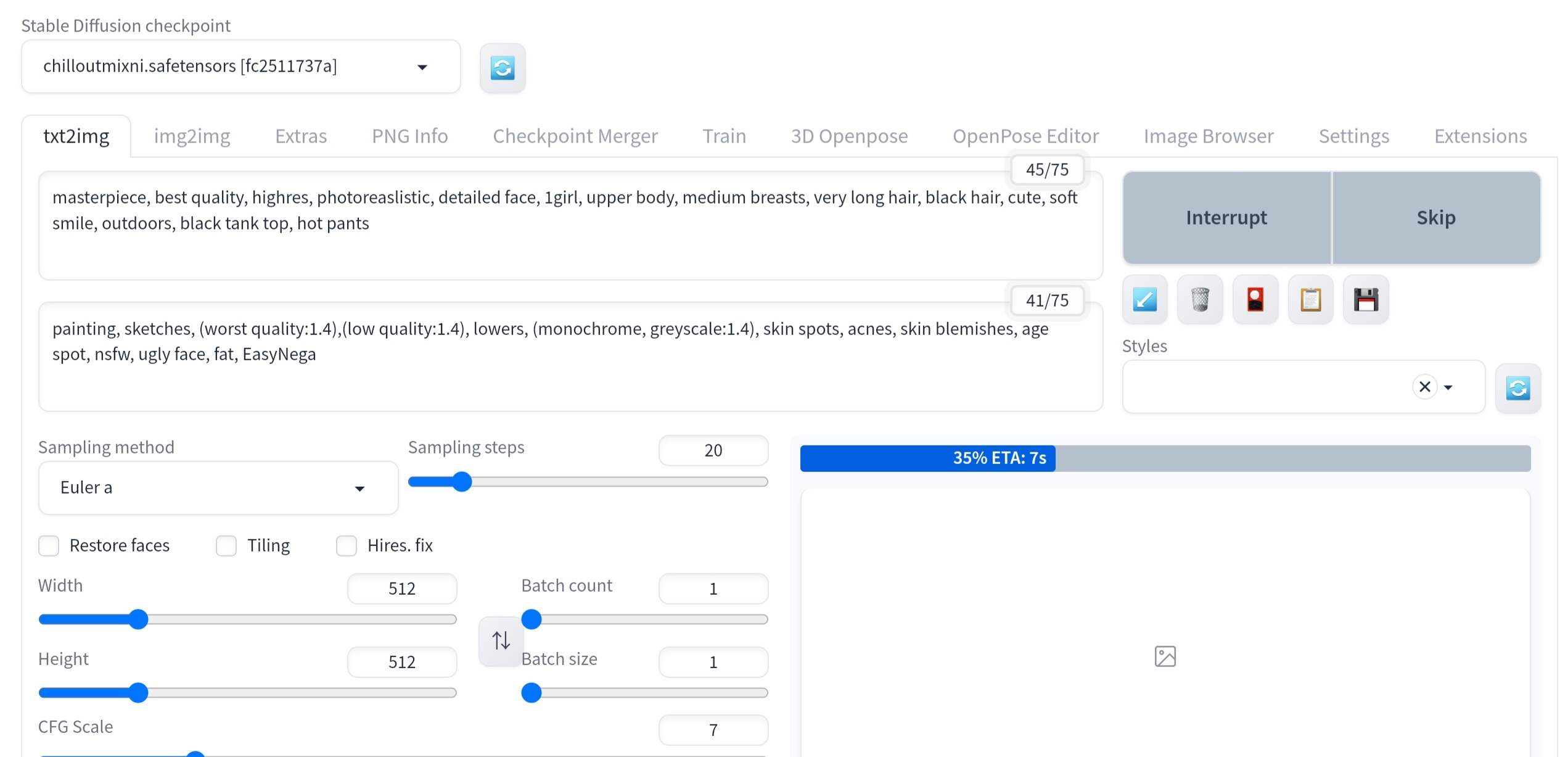 단점은 도입 과정이 가장 어렵다는 점과, 사용하고 있는 PC의 GPU 스펙에 따라서, Colab보다 압도적으로 일러스트의 생성 속도가 느려진다는 점입니다.