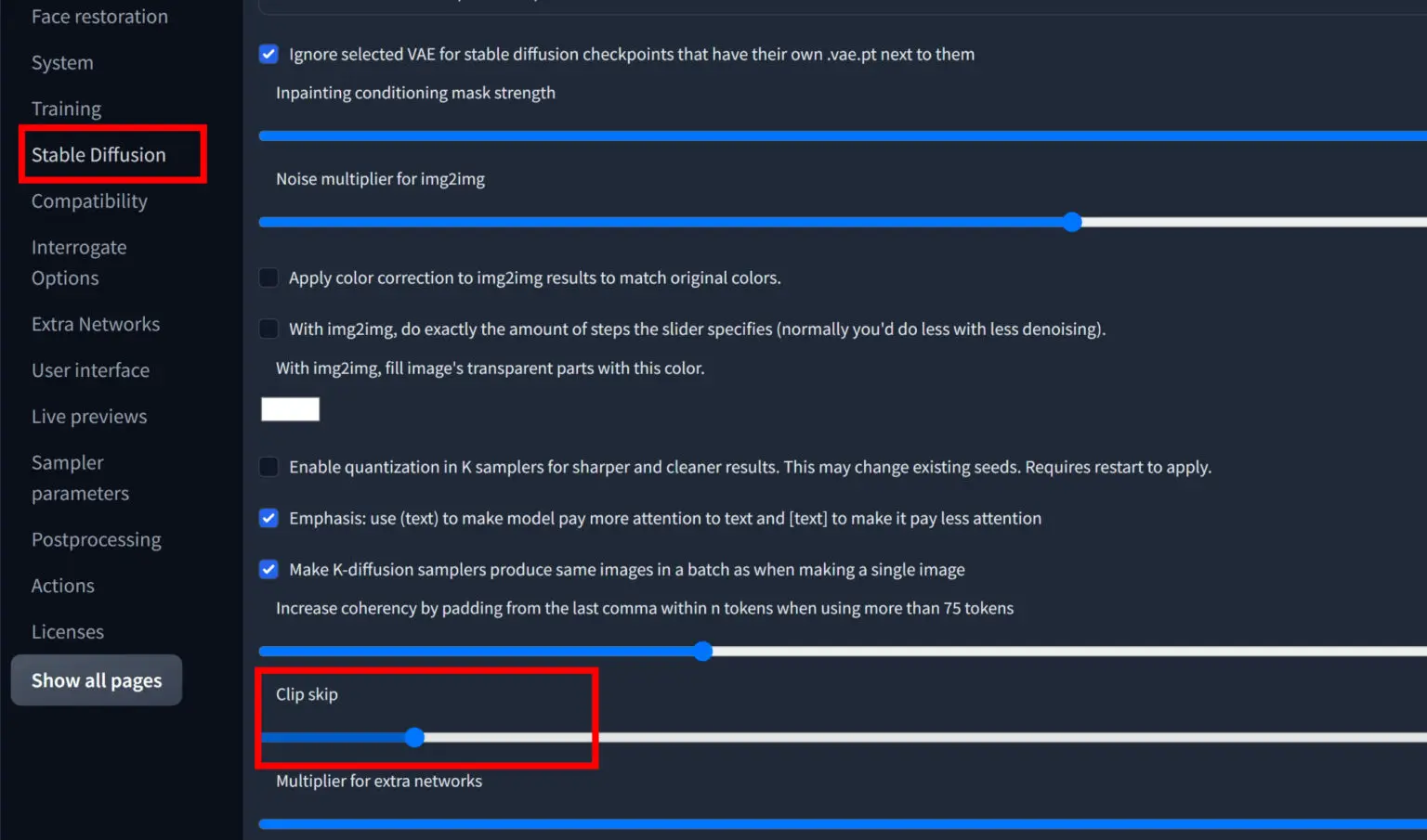 Setting → Stable Diffusion → Clip Skip에서 변경할 수 있습니다.