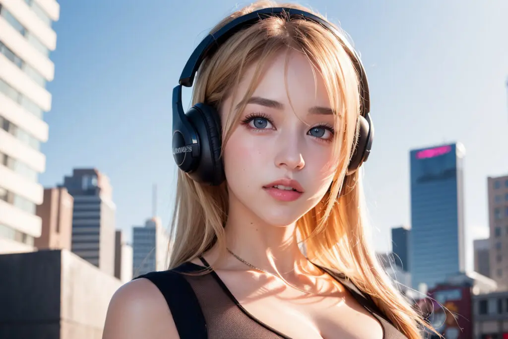 masterpiece, best quality,ultra high res,(photo realistic:1.4),1 girl,big breasts,big blue eyes,blonde hair,upper body, close up of face shot, (ulzzang-6500-v1.1: 1.0),cute, seductive smile, young, posing, lustrous skin, very long hair, cyberpunk, sword, city, headphones,