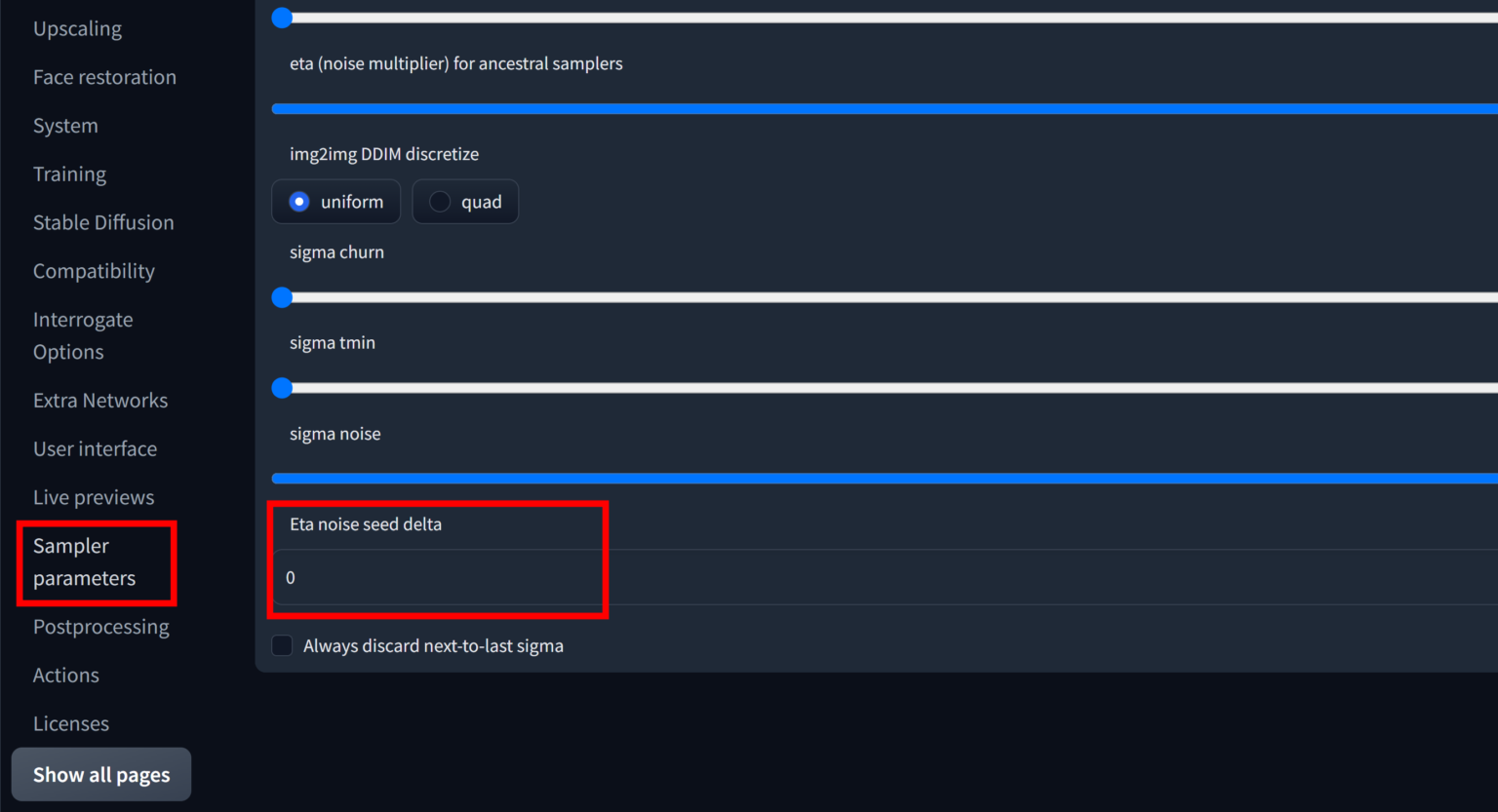 Setting → Sampler parameters → Eta noise seed delta에서 변경할 수 있습니다.