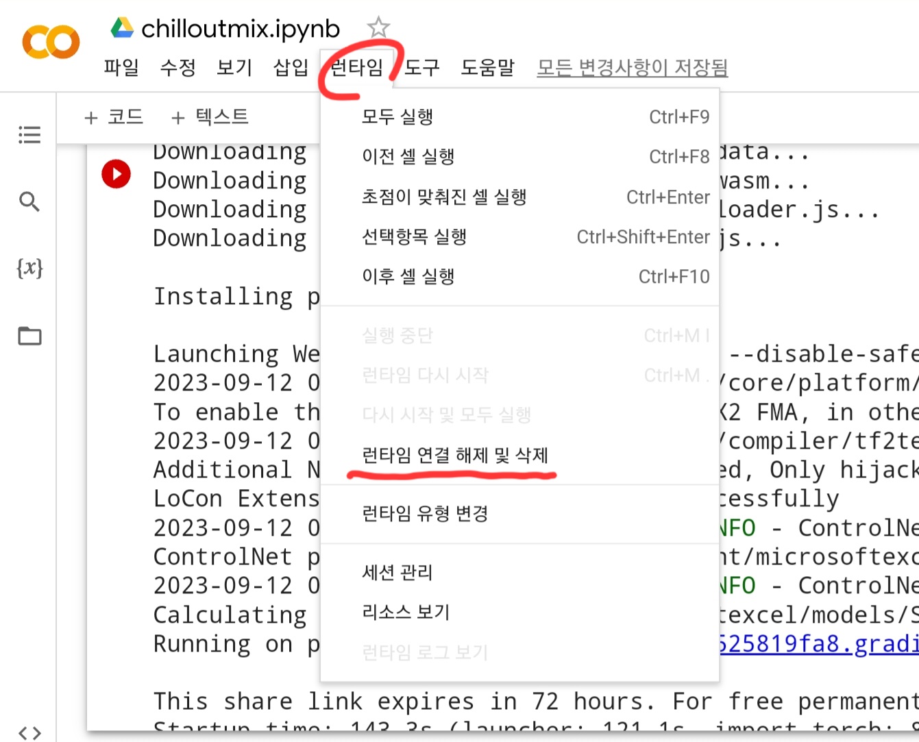 종료하려면 브라우저의 × 버튼을 누르거나 탭을 닫는 대신, Google Colaboratory의 '런타임'→ '런타임 연결 해제 및 삭제'를 선택합니다.