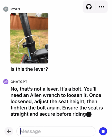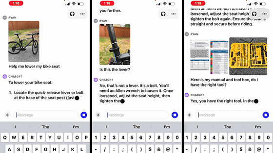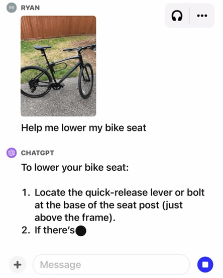 아래의 예에서는 자전거 사진을 보여주면서 ChatGPT에 「자전거 안장 내리는 방법을 알려줘」라고 질문한 결과, 「퀵 릴리즈 레버나 볼트를 조작하세요」라고 안장 내리는 방법을 가르쳐 줍니다.