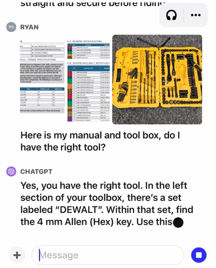 또한 자전거의 설명서와 공구 상자의 사진을 보여주고 "설명서와 공구 상자는 이건데, 맞는 도구가 있나?"라고 물어보니, "공구 상자의 좌측에 들어 있는 「DEWALT」라는 라벨이 붙은 공구가 사용해야 할 공구입니다."라고 가르쳐 주었습니다.