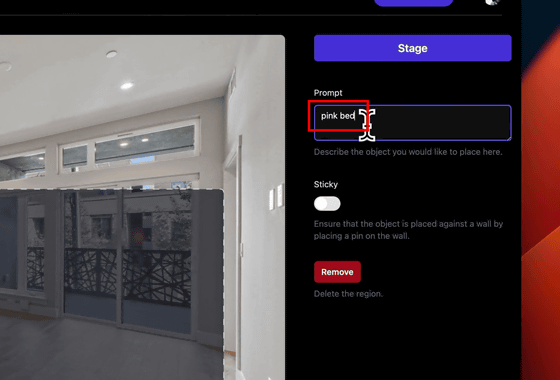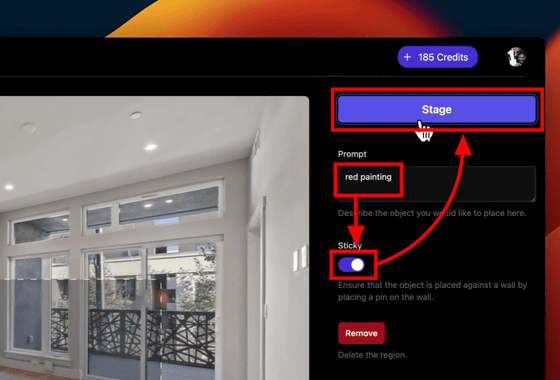 이번에는 "red painting(빨간 그림)"이라고 프롬프트를 입력, 벽에 붙여서 객체를 생성하기 위해 "Sticky"의 스위치를 켜고 "Stage"를 클릭합니다.