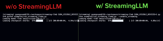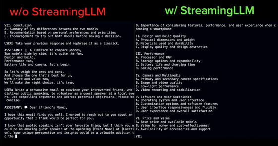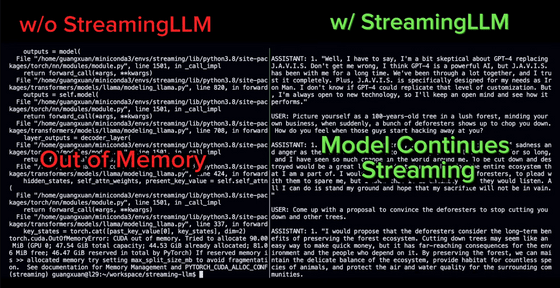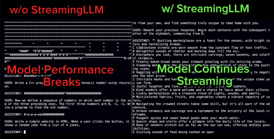 잠시 후 StreamingLLM을 사용하지 않는 모델은 응답이 지리멸렬해졌습니다만, StreamingLLM을 사용한 모델은 성공적으로 응답할 수 있었습니다.