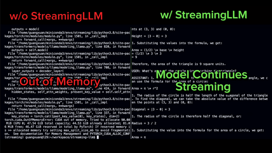 그 후, StreamingLLM을 사용하지 않는 모델은 메모리를 다 사용해 정지해 버렸습니다만 StreamingLLM를 사용한 모델은 계속 움직입니다.