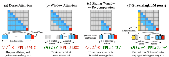 (b)의 Window Attention은 가까운 L 토큰 분의 캐시만을 유지하는 구조로, 시간 계산량은 억제되었지만 최초의 토큰이 캐시 범위로부터 벗어나면 단번에 퍼포먼스가 저하되어 버린다는 것.