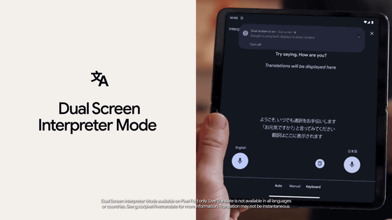 Android 14는 Pixel Fold나 Pixel Tablet에 최적화가 진행되고 있다는 것. Pixel Fold에서는 "듀얼 스크린 통역 모드"가 가능합니다. 이것은, 외측의 화면에 자신이 말한 말의 번역을, 내측의 화면에 상대가 말한 말의 번역을 문장 생성으로 표시하는 것으로, 1대의 Pixel Fold를 앞에 두고 부드럽게 언어의 벽을 넘어 커뮤니케이션을 할 수 있는 기능입니다.