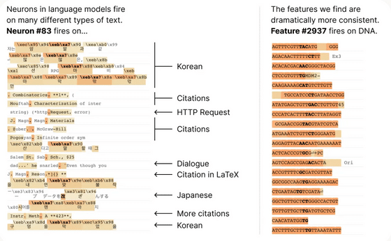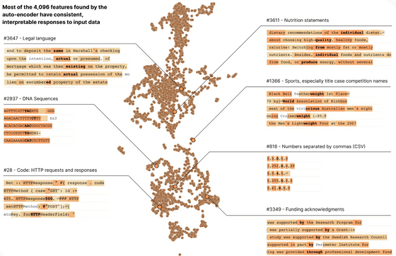 아래 그림은 트랜스포머 언어 모델의 512개 뉴런을 포함하는 레이어를 4096개의 '특징'으로 분해한 그림입니다. 「법률 문장에 반응하는 특징」, 「DNA 시퀀스에 반응하는 특징」등, 개개의 뉴런만 보는 경우보다 더 다양한 기능의 실현에 관여하는 부분을 잘 나타낼 수 있습니다.