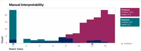 아래 그림은 「개별 뉴런의 경우」와 「특징으로 분해한 경우」의 각각에 대해, 인간에게 「해석 가능성」을 평가받는 블라인드 테스트를 실시한 결과입니다. 녹색으로 표시된 '개별 뉴런의 경우'에는 거의 0점에 집중된 반면, 적색의 '특징으로 분해한 경우'는 고득점을 획득했습니다.