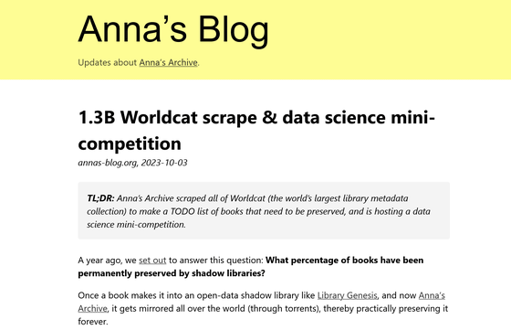 세계 최대급 전자서적 데이터베이스 'Z-Library'가 운영자 체포 및 기소 등 일련의 법적 조치를 받은 데 맞서 비영리의 온라인 섀도 라이브러리 메타서치 엔진으로 만들어진 것이 Anna's Archive입니다. Anna's Archive가 만들어진 당초에는 "전 세계 서적의 약 5%를 보존하고 있다"라고 명명되었습니다. 카탈로그인 WorldCat에서 정보를 추출하고 있는 것이 밝혀졌습니다.