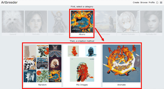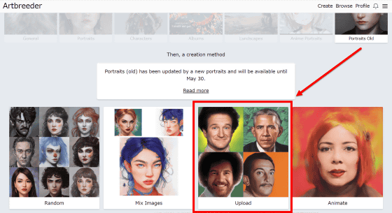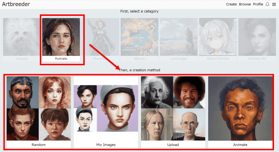 만들 수 있는 이미지는 "General"(일반), "Portraits"(초상화), "Characters"(캐릭터), "Albums"(앨범 재킷), "Landscapes"(풍경), "Anime Portraits"(애니메이션의 초상화), "Portraits Old"(옛날풍 초상화)의 7 종류. 갤러리를 보니 'Portraits Old'가 인기 있었기 때문에 클릭해 봅니다.