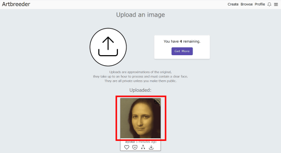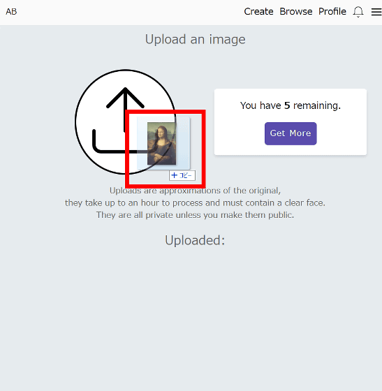 업로드는 PC에 저장되어 있는 이미지를 드래그 앤 드롭하면 OK. 이미지 업로드는 최대 5개까지입니다. 이번에는 모나리자의 이미지를 사용해 봤습니다.