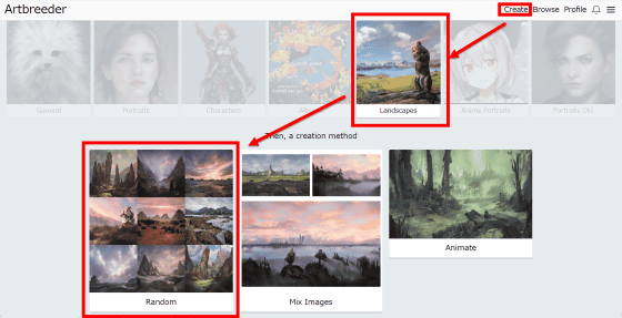 또한 인물 이외의 것도 만들 수 있습니다. 'Create'에서 'Landscapes'를 선택하면 "Random"과 "Mix Images", "Animate" 중 고를 수 있습니다. 우선 Random을 클릭합니다. 또한 업로드 이미지를 사용할 수 있는 것은 7 카테고리 중 'Portraits'과 'Portraits Old'입니다.