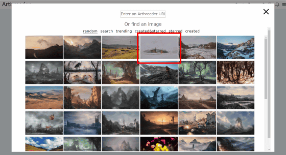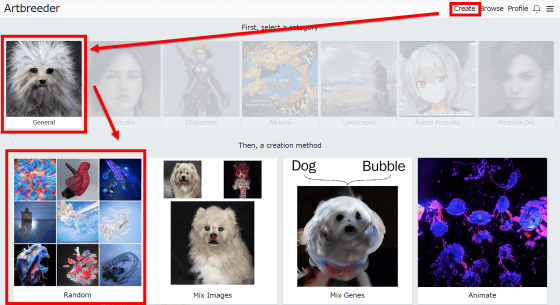 "General"라는 카테고리는 Google의 인공 지능 'DeepDream'이 만들어낸 악몽 이미지와 같은 이미지를 생성할 수 있습니다. 이것도 "Random"을 클릭해 봅니다.