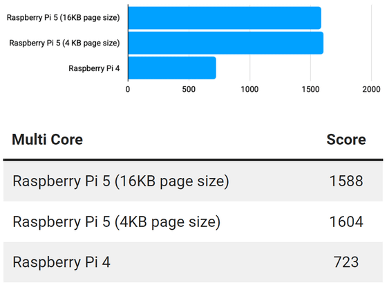 또한 Raspberry Pi OS의 64비트 버전을 실행하는 경우 16KB 페이지 크기가 활성화되어 ARMv7 32비트 바이너리와의 호환성을 희생하며 성능이 약간 향상된다는 것. 그래서 Raspberry Pi 5에서도 16KB와 4KB 모두 페이지 크기를 사용하여 테스트를 실시했다고 합니다.