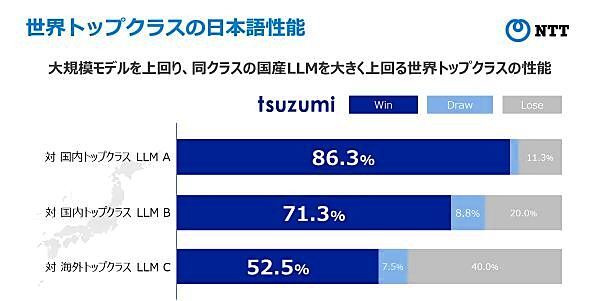 NTT는 2023년 11월 1일, 경량으로 세계 Top 레벨의 일본어 처리 능력을 가진 새로운 대규모 언어 모델「tsuzumi」를 발표했습니다.