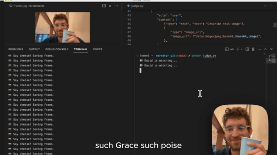 GPT-4V에서 애튼버러의 동물 다큐 어조를 재현하기 위해 홀츠 씨는 특별한 프롬프트를 가진 API를 만들었습니다. 웹캠으로 5초마다 촬영한 이미지를 API를 통해 GPT-4V에 피드 하여 동물 다큐 풍의 나레이션을 생성하고, 그 텍스트를 애튼버러의 음성 샘플로 훈련한 ElevenLabs의 AI 음성 프로파일로 읽는다는 것.