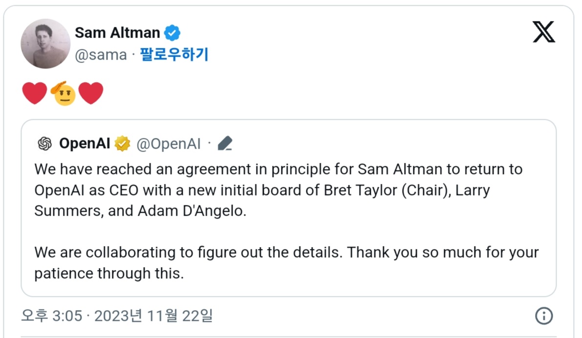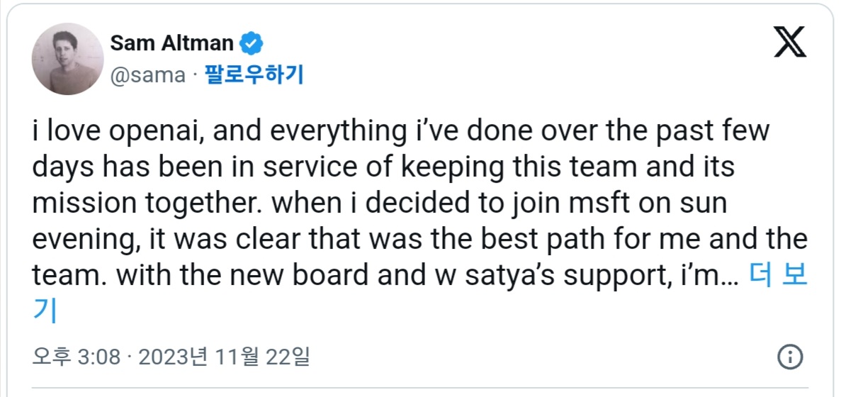 | OpenAI의 직원 90%가 '샘 알트만 복귀와 이사 전원 사임'을 요구하고 MS로 집단 이직 협박 (53) | 2023.11.22 |