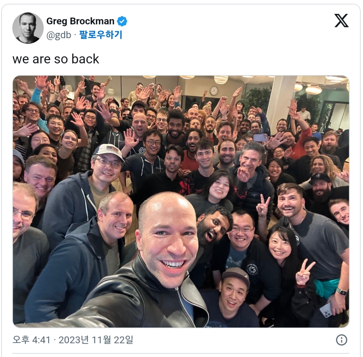 알트만 씨가 퇴임한 데 맞추어 OpenAI의 사장을 사임한 그렉 브록맨 씨는 OpenAI에 복귀한 모습을 투고하고 있습니다.