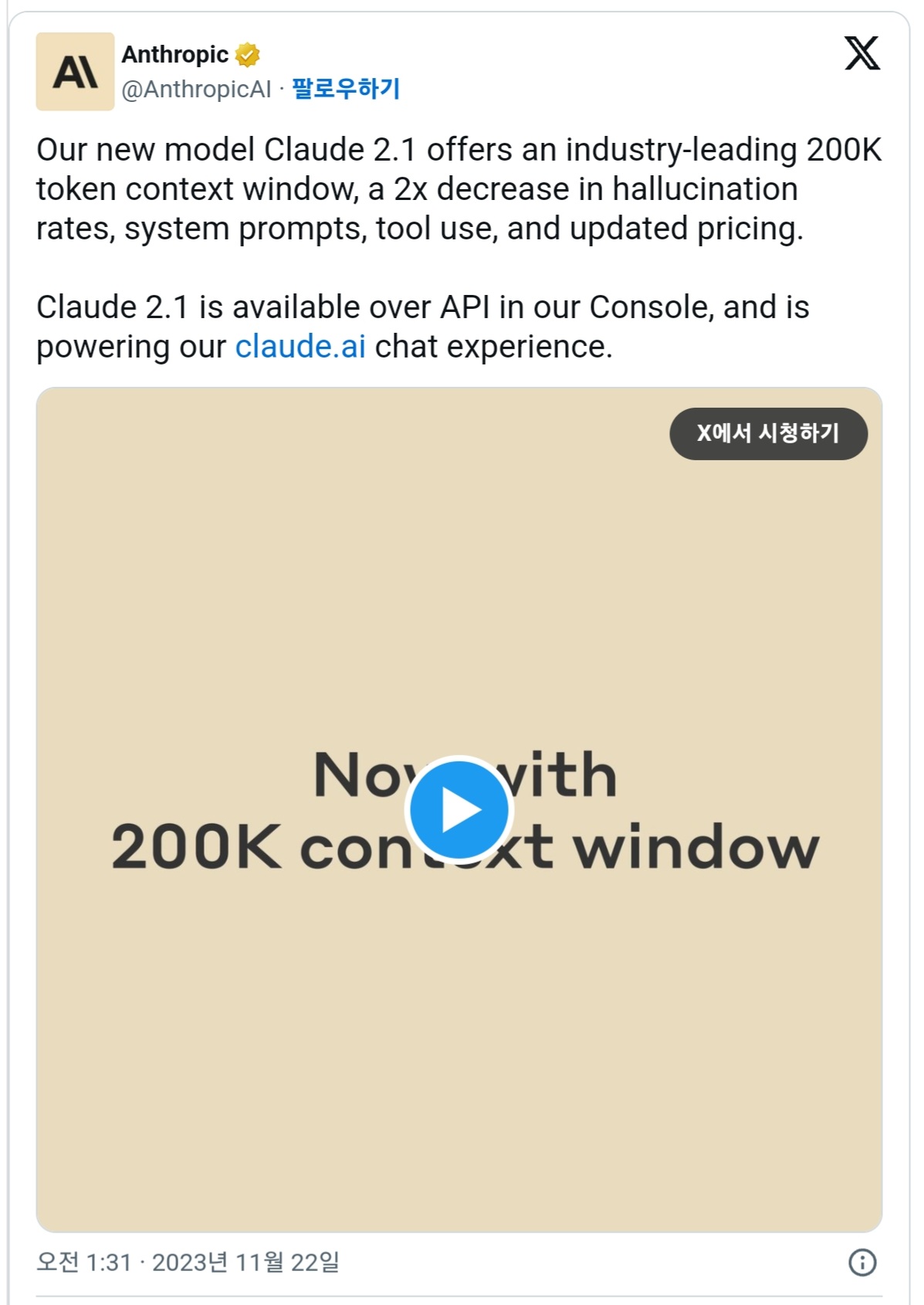 전 OpenAI 엔지니어가 설립한 AI 스타트업인 Anthropic이 대규모 언어 모델인 Claude 2.1을 발표했습니다. Claude 2.1은 처리 가능한 토큰 수가 배가되어 최대 20만 토큰을 받아들이게 되었고, 정밀도도 대폭 향상되고 있습니다.