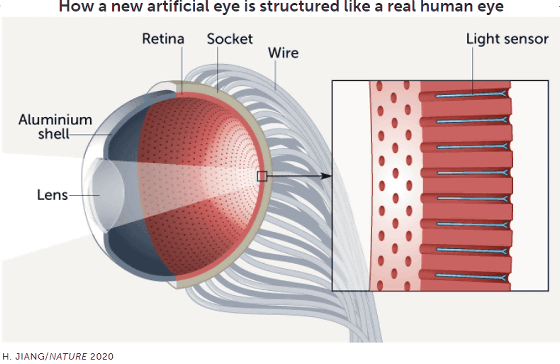 홍콩 과학 기술 대학의 엔지니어이며 재료 과학자인 Zhiyong Fan 씨 연구팀은 인간의 눈의 구조를 모방하여 인공 눈을 개발하고 있습니다. 이 인공 눈의 안쪽에는 인공 망막이 나노 스케일 광센서와 함께 포함되어 있으며, 인공 눈 앞에 있는 렌즈를 통과한 빛의 양을 광센서가 측정하는 구조입니다. 인공 망막의 뒤쪽에 붙은 와이어는 센서가 받은 신호를 외부 회로에 보내는 안구의 시신경 역할을 합니다.