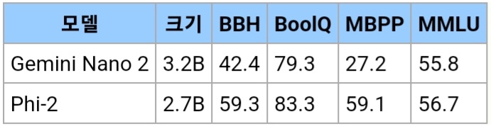 Phi-2는 Gemini Nano 2와 동등하거나 그 이상의 성능을 가지고 있음을 확인할 수 있습니다.