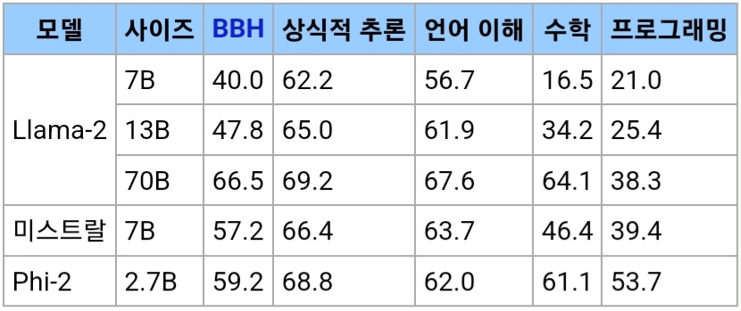 다른 모델과 비교한 벤치마크 결과는 다음과 같습니다. Phi-2는 특히 프로그래밍이나 수학 등 여러 단계가 필요한 추론 작업에서 뛰어난 성능을 발휘하고 있습니다.