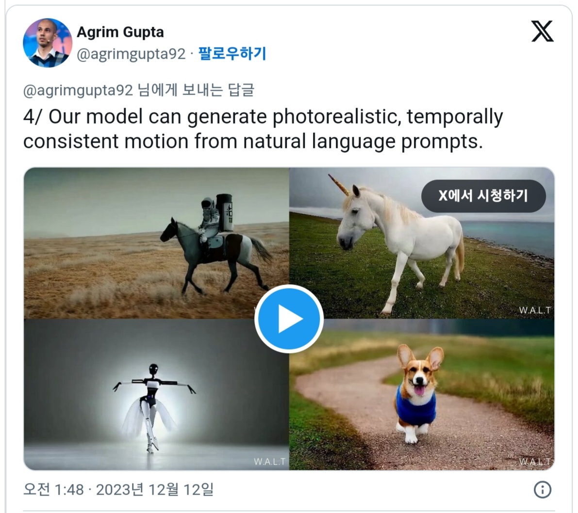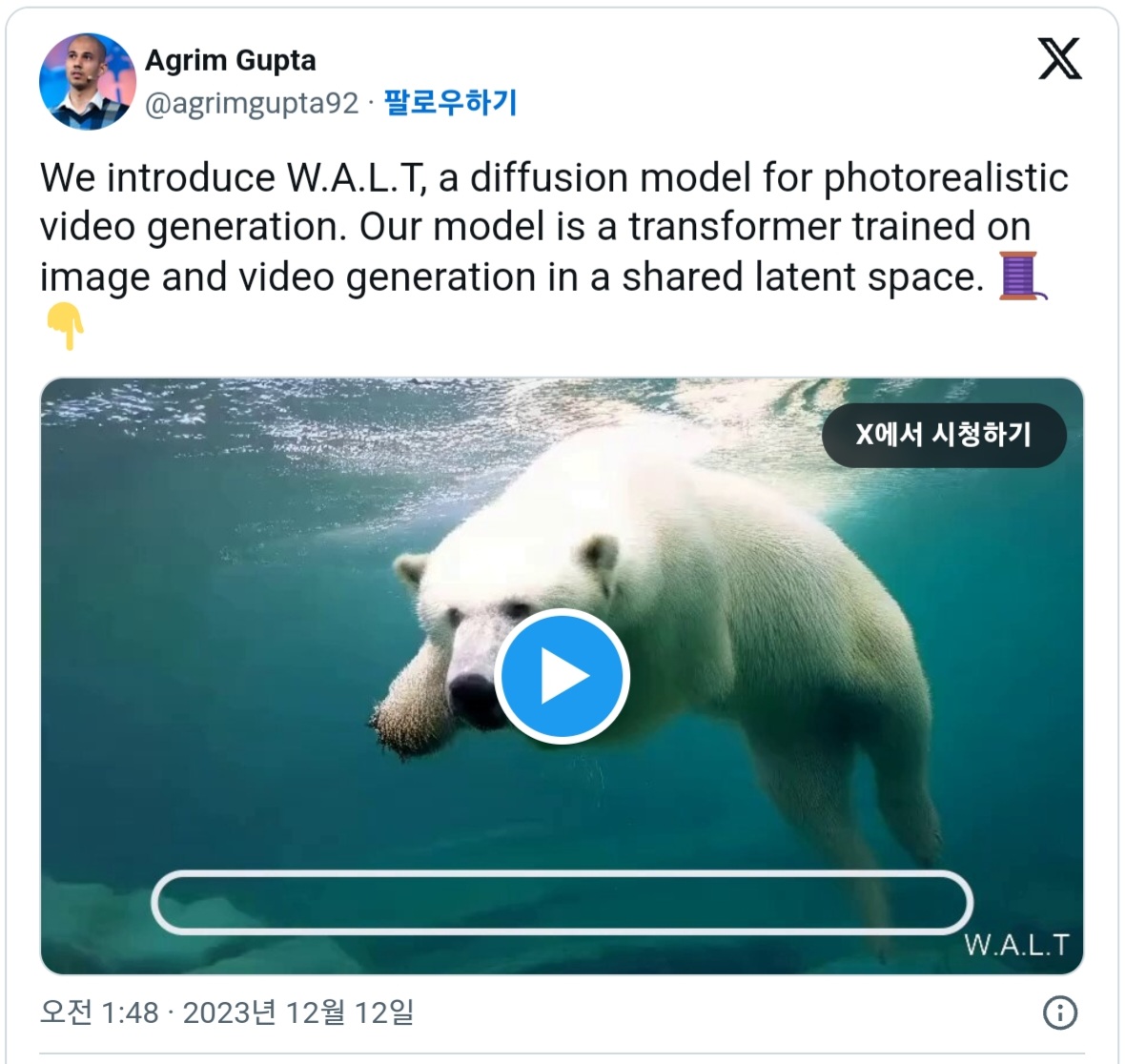 스탠퍼드 대학과 Google 연구팀이 텍스트로 사실적인 동영상을 생성하는 확산 모델인 「W.A.L.T」를 발표했습니다. 실제로 「W.A.L.T」를 사용하여 생성한 동영상도 다수 공개되어 있습니다.