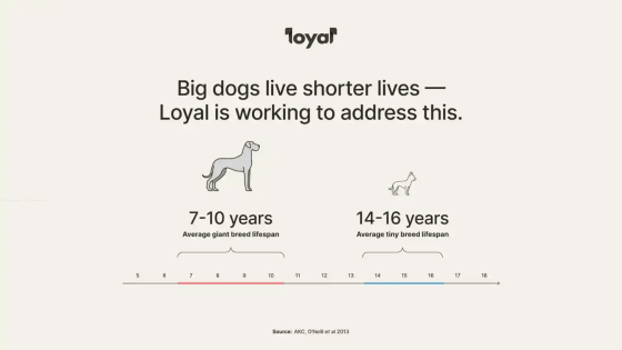 Loyal이 개발한 「LOY-001」이라는 약은 성견의 IGF-1을 줄이는 작용이 있어 수의사가 3~6개월마다 투여함으로써 대형견의 수명이 연장될 것으로 기대되고 있습니다. Loyal의 창업자이자 CEO인 셀린 하오리아는 "미국에서만 2500만 마리의 대형견이 있으며, 삶의 질을 향상할 수 있습니다."라고 코멘트.