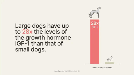 대형견의 수명을 단축시키는 큰 요인은 세포 성장을 촉진시키는 "인슐린 유사 성장 인자 1(IGF-1)"라는 성장 호르몬입니다. 대형견은 체내의 IGF-1 레벨이 높고, 덕분에 젊은 시기에 몸이 크게 성장합니다만, 성견이 되면 IGF-1이 노화를 가속해 버린다는 것. 대형견의 IGF-1의 레벨은 소형견의 최대 28배에 달한다고 합니다.