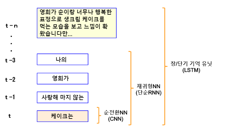 LSTM의 설명에 들어가기 전에 간단한 리커런트 신경망의 장기 의존성 문제에 대하여 복습해 봅시다. 단순 RNN은 초능력자가 아니기 때문에, "나의", "영희가", "사랑해 마지않는", "케이크는" 이라는 문장의 마지막 단어를 맞출 수 없습니다. 하지만 기억 범위가 더 넓어져서 "영희가 순자와 너무나 행복한 표정으로 생크림 케이크를 먹는 모습을 봤습니다"라는 글의 바로 뒤에, "영희가", "사랑해 마지않는", "케이크"가 오면 어떨까요. 이번에는 '생크림'이라는 말이 바로 떠오르네요.