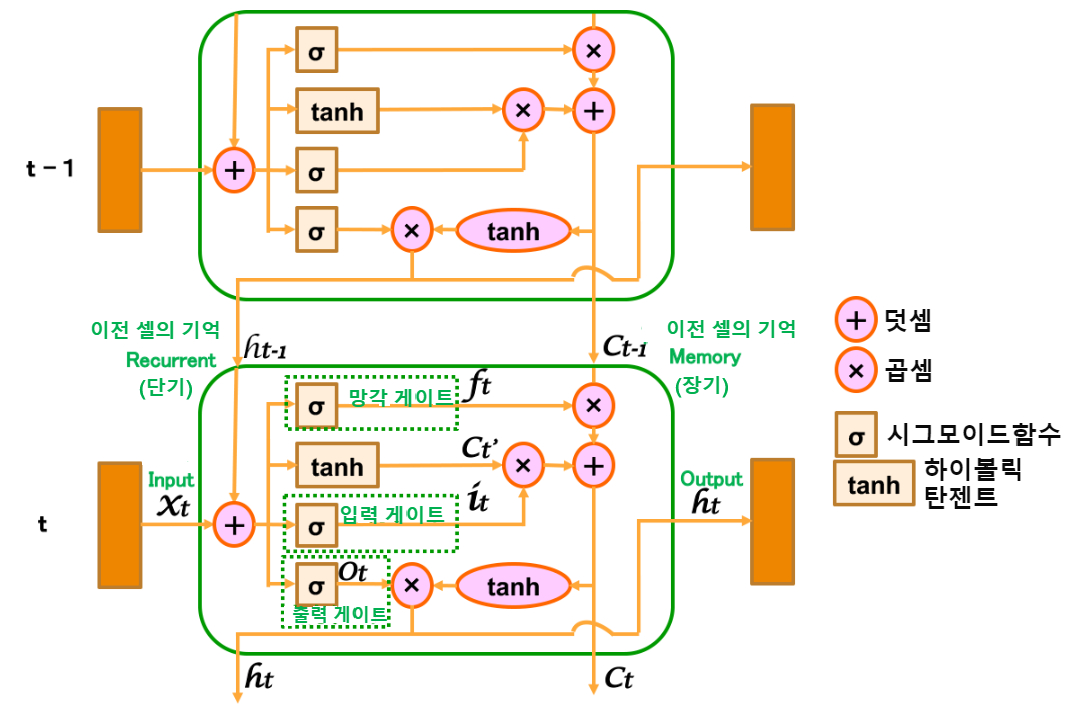 (1) 전 셀의 출력에 기억 라인이 추가됨(ht-1과 Ct-1)