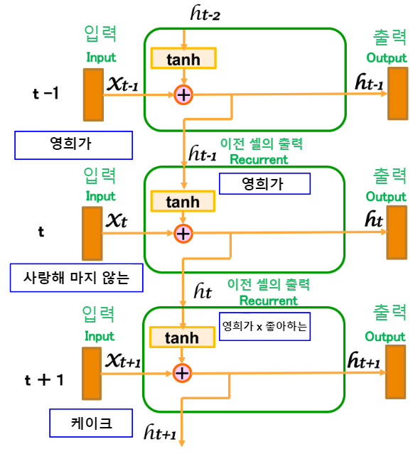 (2) 전 셀의 출력(Recurrent)과 입력의 합류(ht-1과 Xt)