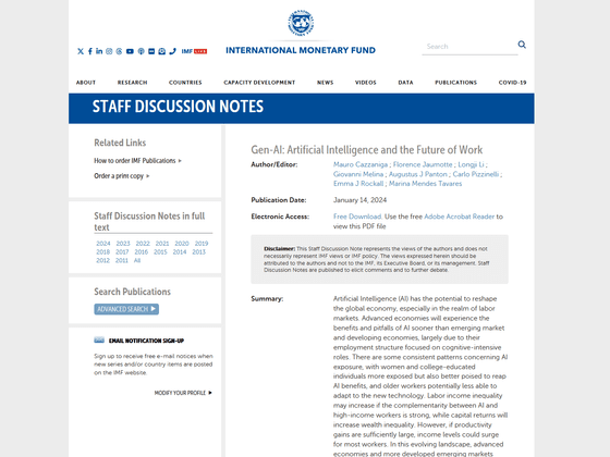 IMF에 따르면 선진국에서 영향을 받는 60%의 고용 중 절반이 'AI에 의해 생산성이 높아진다'는 등의 플러스 영향을 받고, 나머지 절반에 대해서는 현재 인간이 하고 있는 태스크를 AI가 받아들이게 되어 노동 수요 감소나 임금의 저하, 고용 기회의 상실 등 마이너스 영향을 받을 가능성이 있다는 것.