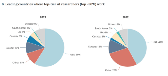 또한, 「 Top 20%의 AI 연구자가 일하고 있는 나라」 를 나타낸 그래프가 아래로, 2019년은 미국이 59%, 중국이 11%, 유럽이 10%, 캐나다가 6%였지만, 2022년은 미국이 42%, 중국이 28%, 유럽이 12%, 캐나다가 2%가 되었습니다.