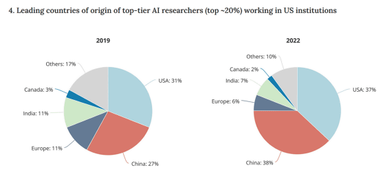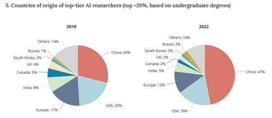 이렇게 탄생한 중국 출신의 AI 연구원은 미국 기업에 중요한 인재입니다. 아래 그래프는 미국의 연구기관에서 일하는 톱 AI 연구원의 출신국을 나타낸 것입니다. 2019년은 미국이 31%, 중국이 27%, 유럽이 11%, 인도가 11%, 캐나다가 3%였지만, 2022년은 미국이 37%, 중국이 38%로 2국에서 그냥 75%를 차지합니다.