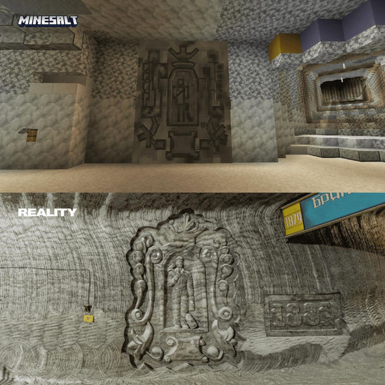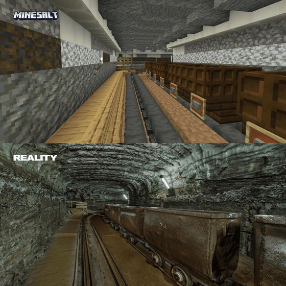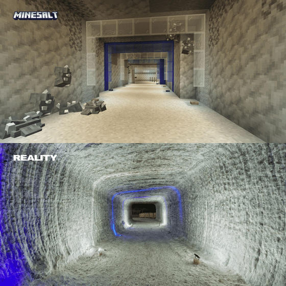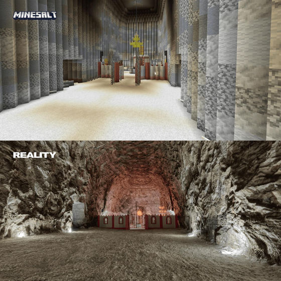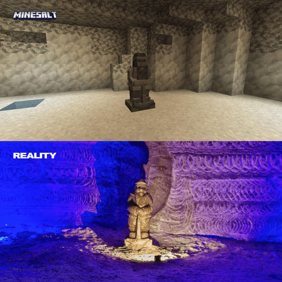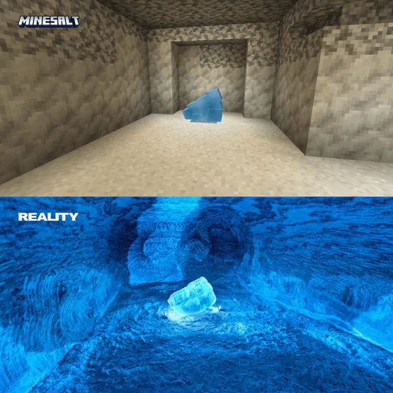 아래는 실제 솔레달 암염 항의 실제 사진(아래쪽)과 마인크래프트로 재현한 것(위쪽)을 비교한 이미지입니다.