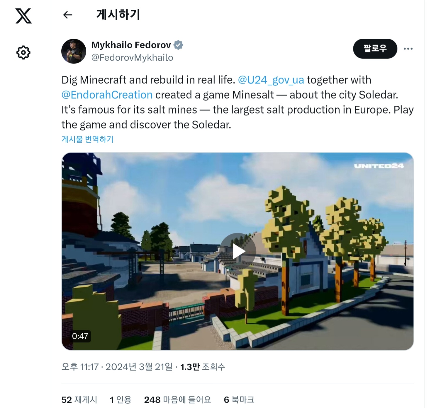 또한 우크라이나의 디지털 개혁 담당 장관을 맡은 미하일로 페드로프 씨도 X 계정에서 마인 솔트를 어필했습니다.