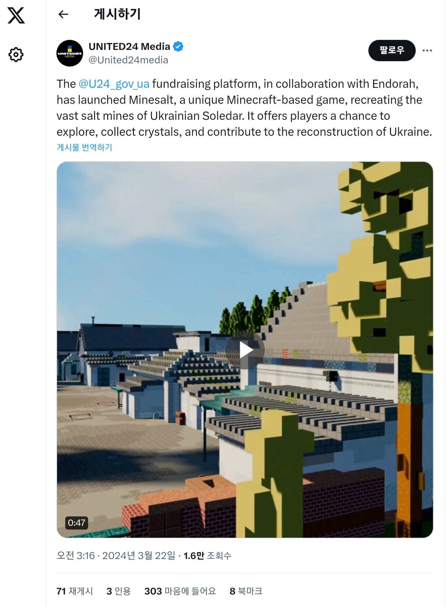 프랑스 게임 크리에이터 팀인 Endorah가 우크라이나의 젤렌스키 대통령이 설립한 우크라이나에 지원금을 모으기 위한 조직 UNITED24와 협력하여 마인크래프트를 플레이하면서 우크라이나에 지원금을 기부할 수 있는 「마인 솔트」 를 발표했습니다.