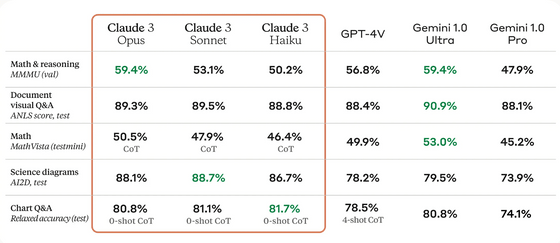 사진, 차트, 그래프, 기술도 등의 비전 기능에 대한 벤치마크 결과는 아래 그림과 같습니다. 최상위 모델인 Claude 3 Opus는 GPT-4V를 모든 벤치마크 결과에서 능가합니다.