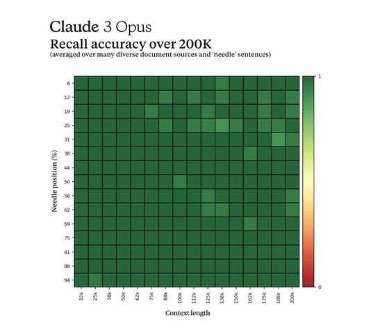 Claude 3의 모델은 20만 토큰까지의 컨텍스트 길이에 대응하고 있으며, 이러한 긴 컨텍스트를 효율적으로 처리하려면 재현율(Recall)이 중요합니다. 최상위 모델인 Claude 3 Opus는 정확도 99%를 넘는 거의 완벽한 재현율을 달성할 수 있었다고 합니다.