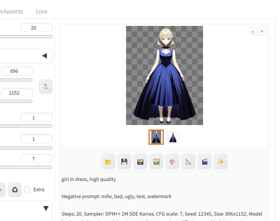 Steps: 20, Sampler: DPM++ 2M SDE Karras, CFG scale: 7, Seed: 12345, Size: 896x1159, Modelhash: 7 , layerdiffusion_enabled: True, layerdiffusion_method: Only Generate Transparent Image (Attention Injection), layerdiffusion_weight: 1, layerdiffusion_ending_step: 1, layerdiffusion_fg_image: False, layerdiffusion_b_image _resize_mode: Crop and Resize, Version: f0.0.17v1.8.0 rc-latest-269-gef35383b