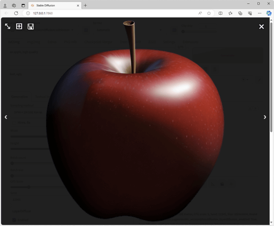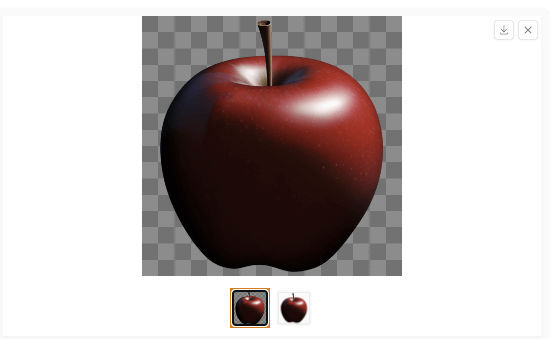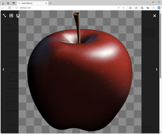 이미지의 생성 결과는 이런 느낌. 사과 주위가 잘린 투과 이미지가 생성되었습니다. 덧붙여 sd-forge-layerdiffuse나 모델 데이터의 버전이 다른 경우는, 위의 설정을 통째로 카피해도 다른 이미지가 생성됩니다.